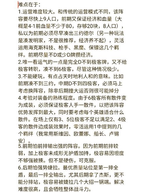 〖Four〗、海克斯强化选取对阵容至关重要,尤其是妙手空空或废品厂。装备选取优先反曲弓或大棒,确保拥有羊刀或电刀,后期根据阵容需求调整装备。总体而言,极客95阵容在当前版本表现出色,关键在于合理的海克斯强化选取、快速过渡至高人口以及核心装备的分配。