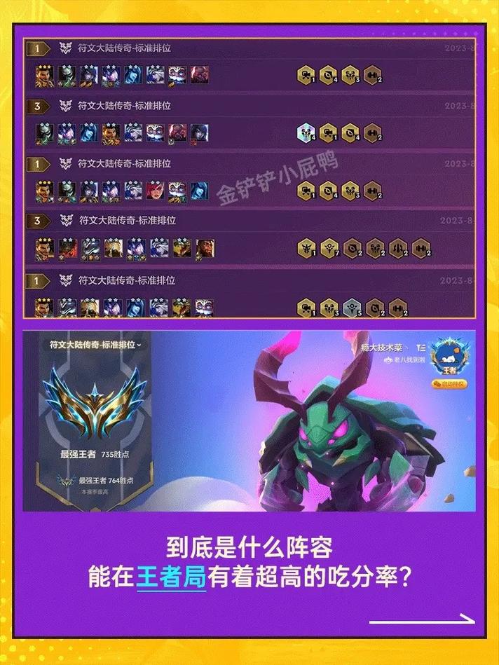 〖Two〗、**挑战**:前期主C狼人,后期增加蝙蝠吸血刀提升续航能力。 **暗影格温**:利用格温的强大能力,与其他羁绊结合。 **佛雷转**:利用佛雷的强大羁绊提升阵容强度。1 **神谕**:以卡尔玛为核心,搭配其他英雄形成强力神谕阵容。二:经济运营 金币管理是金铲铲的关键。
