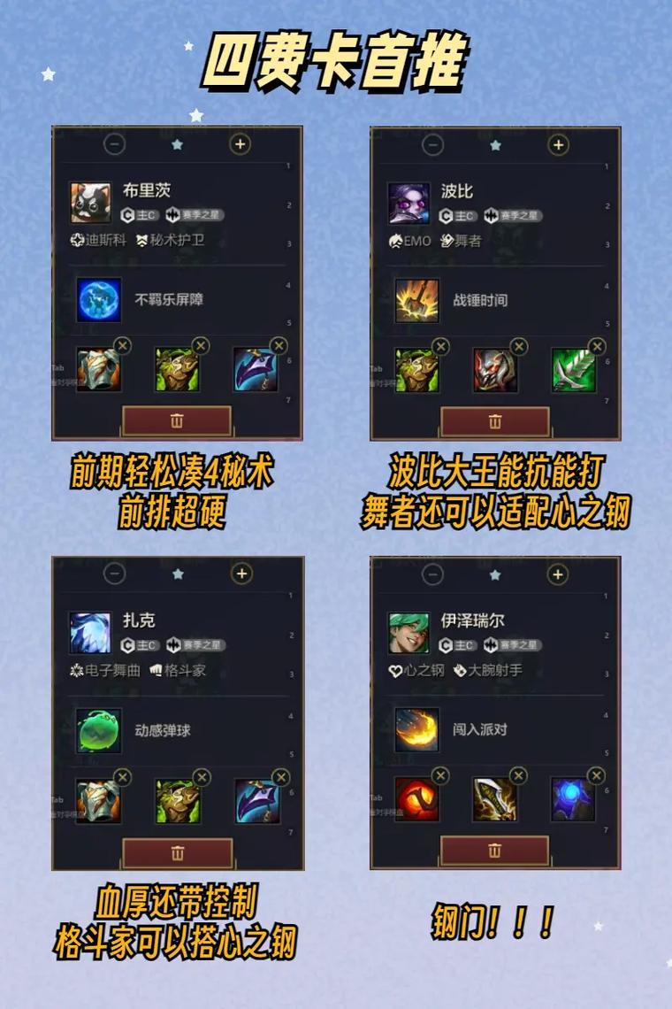继续提升阵容整体强度和羁绊效果。 符文与英雄之力推荐 符文:战术优势、了解你的敌人、魔杖、恕瑞玛的传承、珠光莲花等。 英雄之力:装备类的伊泽瑞尔、崔斯特、巴德都可。