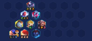 前期用3未来战士搭配2护卫、2爱心使者、2强袭枪手的羁绊打工过渡。肉装可以先给潘森,输出装可以先给艾希。后期成型:尽快拉到8人口后,大搜卡找二星的盖伦和莎弥拉。如果能找到终极伊泽瑞尔则开3枪手,找不到可以先补龙王、剑魔这样的强力4费卡。未来战士的复制格子根据位置灵活选取复制慎或伊泽瑞尔。