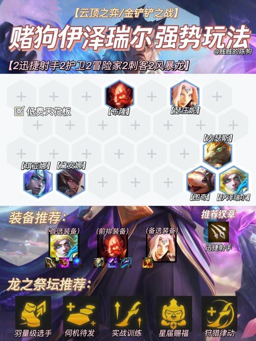 〖One〗、阵容运营: 开局抢:反曲弓,优先做羊刀,其次大剑或拳套。 前期过渡:2迅捷射手搭配格斗、护卫、重骑兵等前排连胜过渡,霞的装备给伊泽瑞尔打工。21升四,25拉五,32拉六。 中期运营:37或41拉七,大搜出一张霞+杰斯稳定血量,没有呲呲就上人马、努努等开高重骑。逆风则在7级搜出2星霞再上八。