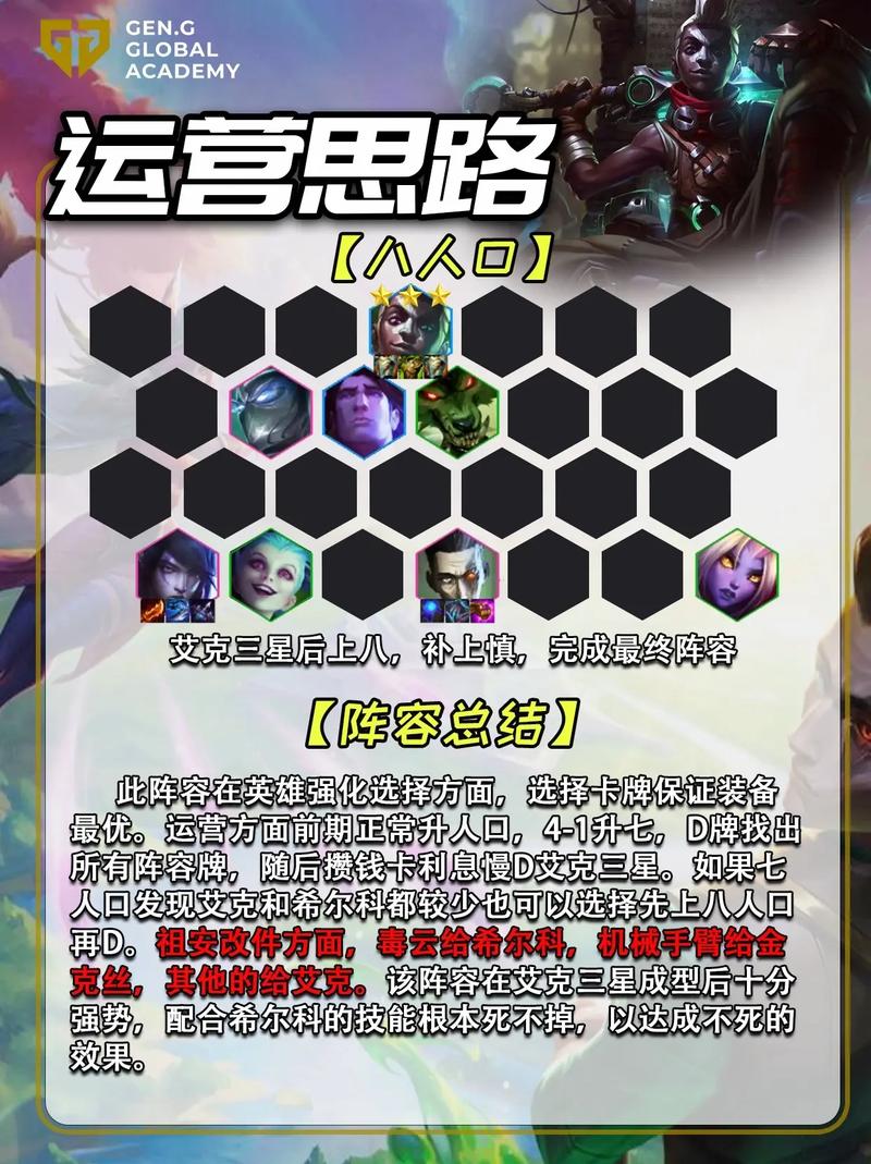 首先,阵容组成以巨魔、蔚、杰斯、机器人、风女、金克丝、猫咪和艾克、炸弹人为主,构建6极客羁绊,结合2姐妹、1猫猫、2未来守护者、2执法官和2格斗家、2学者的组合,确保羁绊效果最大化。