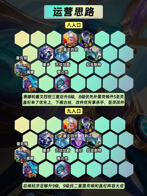 〖Three〗、恕瑞玛沙皇阵容 阵容组成:鳄鱼、岩雀、纳亚菲利、狗头、沙皇、皇子、奎桑提、剑魔。羁绊:6恕瑞玛、2主宰、2司令、2暗裔。该阵容通过恕瑞玛的羁绊效果,能够大幅提升队伍的整体作战能力。核心装备:主C沙皇建议装备羊刀、法爆、巨杀,这些装备能够大幅提升沙皇的输出能力,使其在战斗中发挥关键作用。