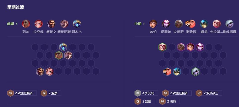 建议使用3圣光+2游侠+2骑士作为打工阵容,即使没有韦鲁斯,其他阵容亦可作为过渡选取,如3神盾+3哨兵。经济优先于血量,关注韦鲁斯的飓风与正义之手,若有铲子,可考虑圣光转职给予艾希或薇恩。进入3阶段,3-2阶段左右升级至6人口,若韦鲁斯数量较多,则考虑这套阵容。