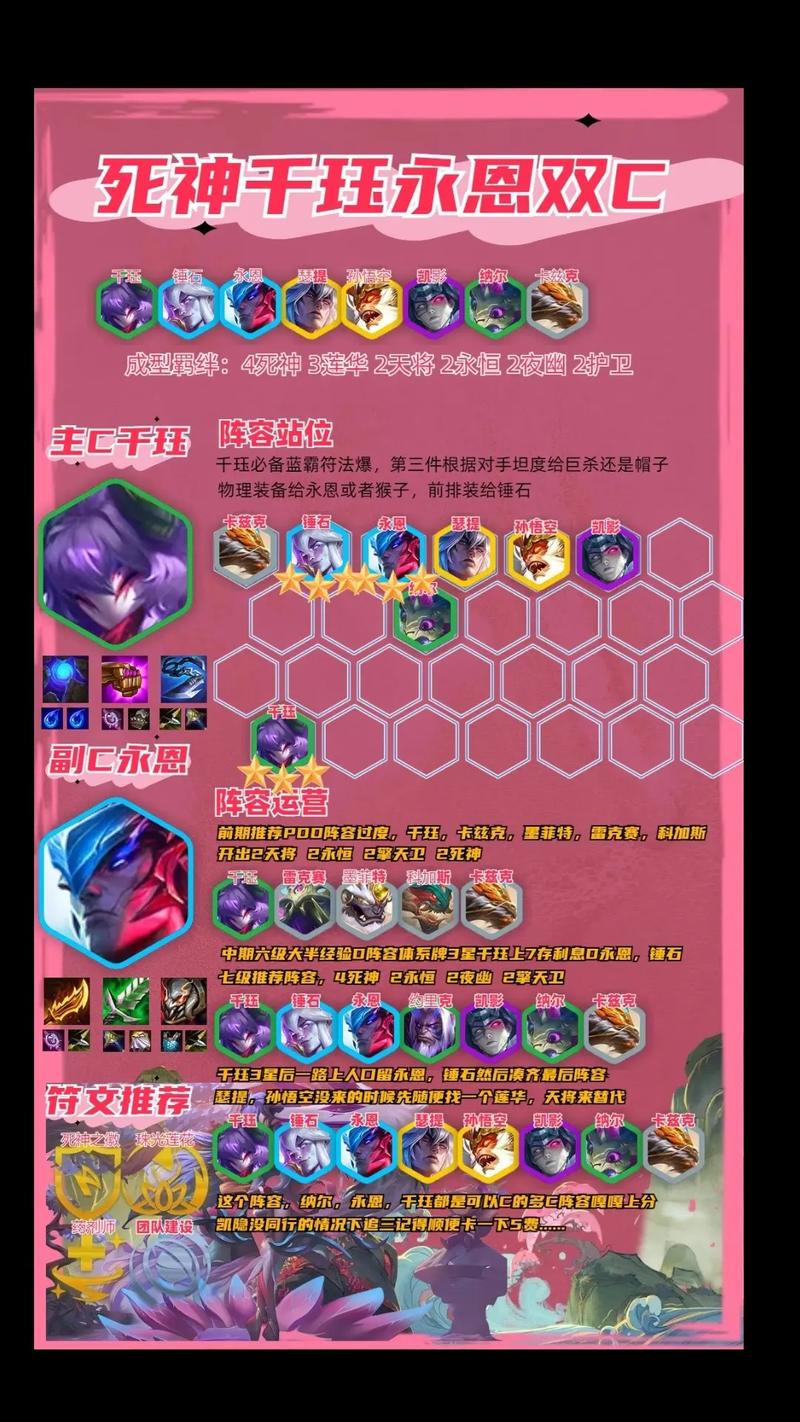 〖One〗、金铲铲之战S11永恩主C阵容玩法如下: 阵容搭配- 核心英雄:永恩作为主C,搭配夜幽和死神羁绊,能够大幅提升输出能力和生存能力。