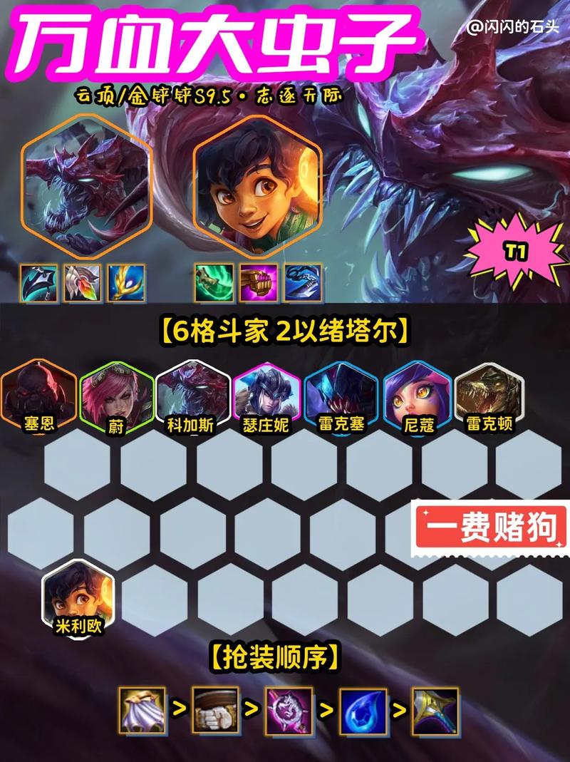 〖One〗、《金铲铲》大虫子阵容是卡莎+克格莫+科加斯+加里奥+蒙多+马尔扎哈。羁绊搭配:5变异战士+2巨像+2格斗家+1社交名流。海克斯推荐:优先变异战士之冕、护甲镀层、变异战士之徽、次选泰坦之劲、逆风斗志、变异战士之心。