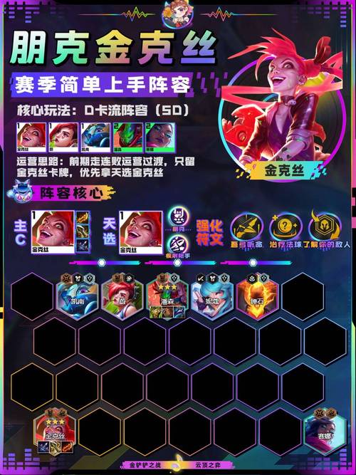 六骑天使阵容 核心英雄:凯尔(天使)、贾克斯(武器大师)等。阵容特点:该阵容以天使的高爆发输出为核心,配合武器大师等英雄的坦度和控制,能够在团战中迅速击败敌方关键目标。羁绊搭配:主要依赖骑士和征服者羁绊,提升团队的生存能力和输出能力。星守妮蔻阵容 核心英雄:妮蔻、辛德拉等。