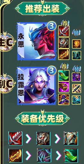 〖Two〗、佛耶戈:薄暮法袍。这件装备能够为佛耶戈提供法术穿透,提升他的技能伤害。铁男:狂徒铠甲、兹若特传送门、心之钢。这些装备能够大幅提升铁男的生存能力和前排坦度。运营策略 前期:拿到永恩后,可以直接开始赌三星。如果有同行,则建议放弃此阵容,因为同行会争夺相同的英雄,导致难以三星。