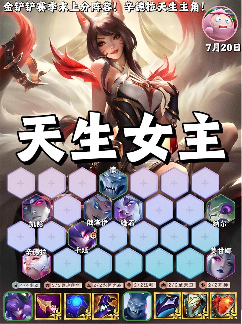 〖One〗、金铲铲之战s11永森辛德拉阵容羁绊搭配攻略阵容构成:阿狸、千珏、纳尔、锤石、奥恩、辛德拉、安妮、沙皇、瑟提;羁绊效果:5灵魂莲华、4永恒之森、2法师、2护卫、2神谕者、2擎天卫;装备优先给辛德拉双头盔+法爆或法强。副C千珏装备带法强,有沙皇可以带剩余法强装备。