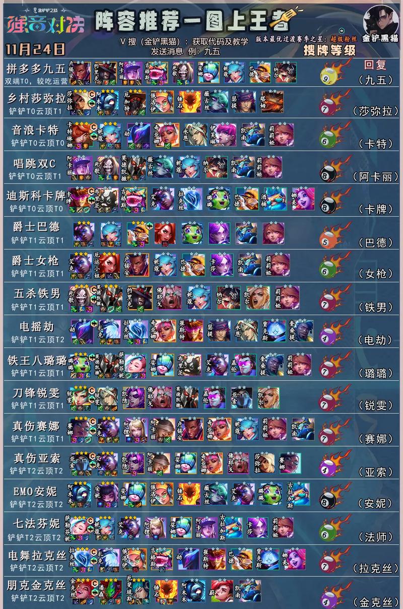 〖Two〗、金铲铲强音对决阵容推荐如下:第一套阵容:凯特琳、崔斯特、艾克、李青、蔚、布里茨、雷克顿、锐雯。核心:以凯特琳和崔斯特为输出核心,凯特琳快速清理前排,崔斯特对后排造成大量伤害。控制:艾克和李青提供控制效果。坦克:蔚和布里茨负责吸收伤害。优点:爆发力强,能在短时间内消灭敌人大量有生力量。
