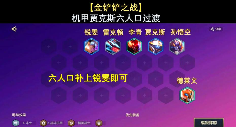 开局装备:优先反曲之弓,用于合成贾克斯的核心装备疾射火炮。2阶段:根据场上情况选取连胜或连败策略,选秀时优先拿反曲之弓和任意散件。3阶段:3-1阶段跳6人口或5人口开出3战斗机甲2/4斗士羁绊,3-2阶段小D出4斗士3战斗机甲羁绊。