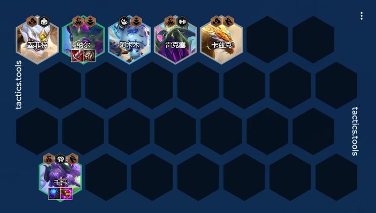 阵容构成:大嘴+风女+掘墓+拉露恩+莉莉娅+安妮+奥恩+泰坦+沙皇;羁绊效果:6神谕3山海2擎天卫2森林2夜幽;阵容站位借鉴下图所示:装备搭配 莉莉娅主c带回蓝法强装,优先青龙刀、法爆、大帽。安妮带肉装站前排作主T,拉露恩带青龙刀和鬼书提供辅助和减伤效果。