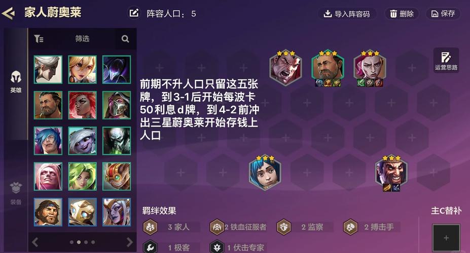 前期过渡:前期可使用3家人阵容进行过渡,优先D出3家人3星,特别是爆爆需要尽快达到3星。在爆爆3星后,可考虑上6人口。海克斯选取:优先拿取转职类海克斯,以便后续组成所需羁绊。装备分配:爆爆的核心装备为科技枪、法爆和大帽,这些装备能大幅提升其输出能力和生存能力。