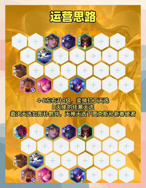 〖One〗、前期运营:在前期,可以尽量凑齐3神将2游侠的羁绊,以保证阵容的坦度和输出。同时,注意留意选秀中的反曲之弓,为薇恩的装备做准备。中期过渡:中期可以逐渐补充神将和游侠棋子,凑齐7神将2游侠的羁绊。同时,注意提升棋子质量,保证中期战斗力。后期成型:在后期,尽量凑齐高费神将棋子,如曙光女神、永猎双子等,以提升阵容的整体实力。