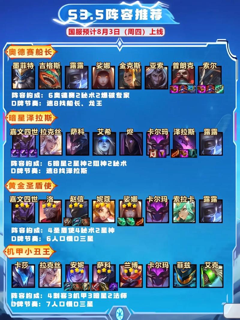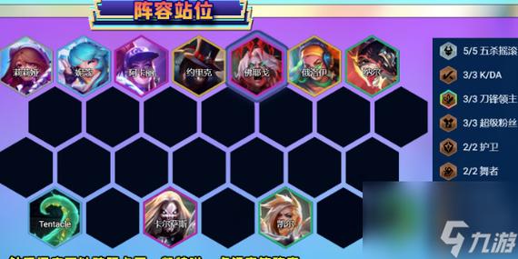 推荐的阵容包括拉克丝、莫甘娜、娜美(替换为任意决斗大师若天选之人是玉剑仙)、剑姬、泰隆(男刀)、艾瑞莉娅(刀妹)、猫咪、迦娜(风女)。剑姬作为天选之人,是最终阵容的核心。如果天选之人是玉剑仙,则娜美应替换为任意决斗大师,以发挥玉剑仙普攻回蓝快的特点,以及猫咪和风女的强力回复能力。