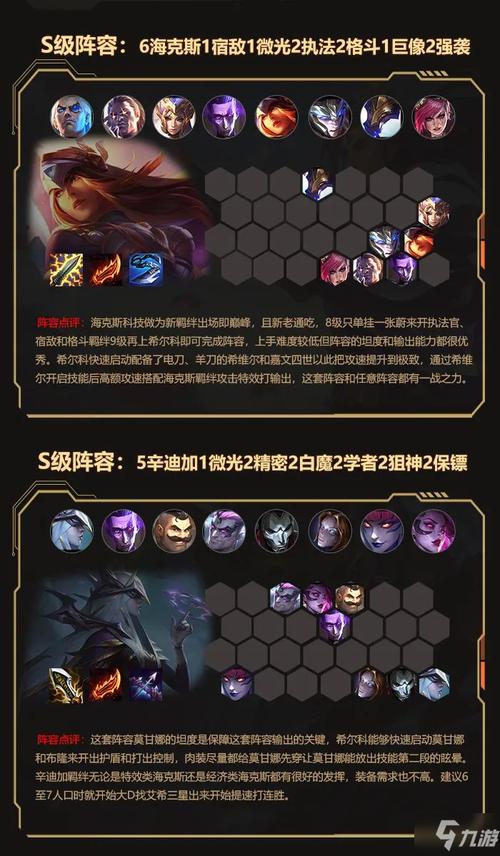 第一套阵容:辛迪加艾希 组建阵容:艾希、杰拉、诺手、布隆、莫甘娜、余、发条。若辛迪加调整,8人口补阿里,7人口补4名狙击神。后期转换容易。艾希装备关键,轻语、无尽必备,提高伤害与破甲,第三件可选巨人捕手、分裂弓或物理输出装。莫甘娜装备肉装,杰拉则需蓝色与法强装。位置上注意艾希不秒杀。