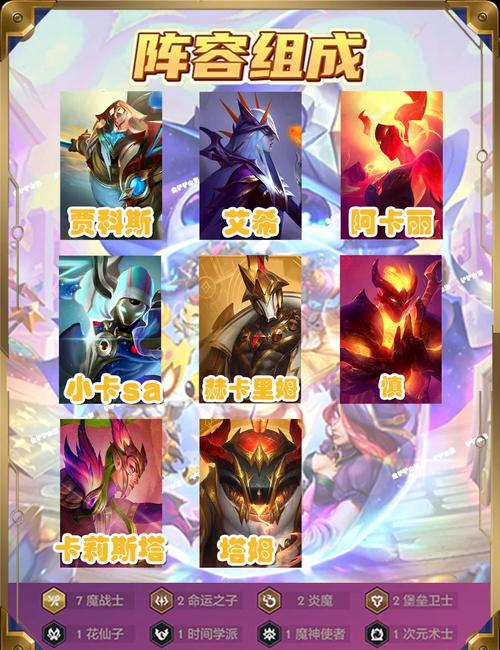 〖Four〗、首先,阵容选取上,你可以尝试以下组合:3费的莫甘娜、4费的布隆、1费的诺手、4费的雷娜塔、2费的婕拉、4费的发条、2费的寒冰射手(艾希)和4费的烬。羁绊构成是5辛迪加,加上2狙神、2学者、2保镖和2白魔,以及2精密元素。