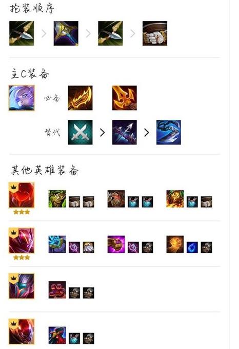 〖Two〗、装备分配方面,寒冰优先选取轻语,搭配轻语、巨杀、无尽为最优组合。卡萨丁则倾向于选取救赎与板甲,其他装备根据情况灵活调整。海克斯推荐的组合包括羽量级、狙神之巢、狙神、保镖、存心失利、利滚利、辛迪加、我为人人、直击弱点、后排、大天使、星神、狩猎、发薪日等,旨在强化阵容整体的战斗力。
