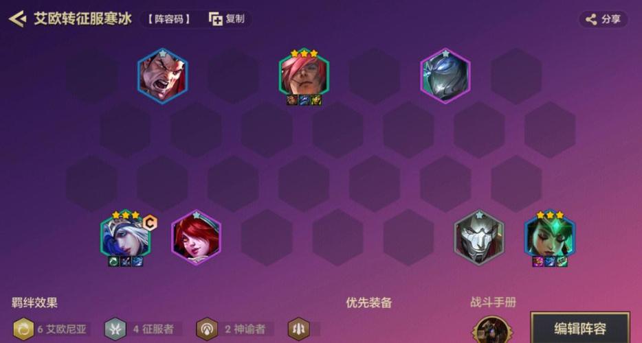 〖Five〗、在《金铲铲之战》游戏中,艾希作为2费卡,具有辛迪加和狙神羁绊,常常在辛迪加阵容中担任输出角色。因此,艾希的装备选取至关重要。推荐优先选取轻语和无尽,这两件装备能够显著提升她的输出能力。第三件装备可以根据对手的阵容灵活选取,羊刀、杀人剑或巨杀都是不错的选取。
