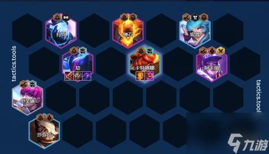 〖Four〗、主c卡特:正义之手/朔极之矛+珠光护手(必备)+超级粉丝给予的正义之手;主坦妮蔻:离子火花(必备)+狂徒+卫冕;副c劫:最优泰坦+饮血剑+夜刃/水银。这套阵容的爆发能力较强,而且整体的弈子费用偏低,成型容易中期好打连胜,后期琪亚娜是必需的核心角色。在6音浪刺客羁绊之前会有一段疲软期。