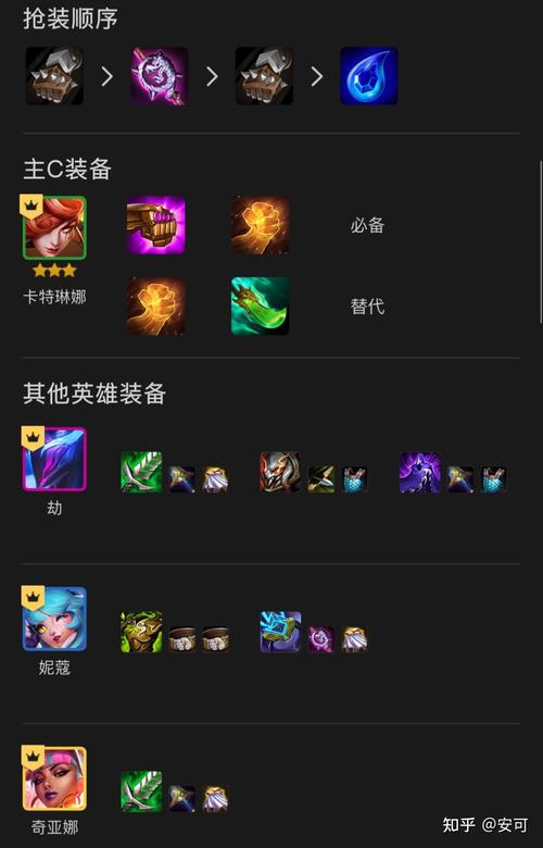 〖Three〗、装备推荐: 卡特琳娜:理想装备为2个正义之手和珠光护手,以实现100%暴击。如果大剑较多,可以替换一个正义之手为朔极之矛。 妮蔻:获取防御装备,提升生存能力。 劫:负责AD输出,装备根据具体情况选取。阵型站位: 离子妮蔻与卡特琳娜同侧站位,以增强输出效果。