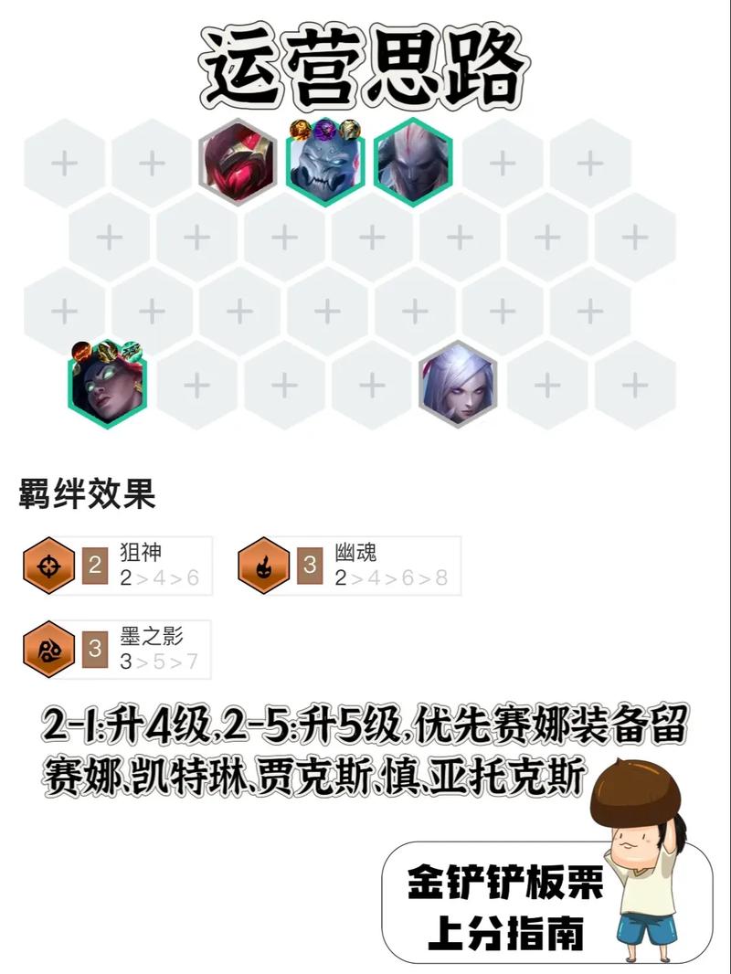 〖Five〗、金铲铲之战S14圣灵塞纳阵容搭配推荐如下:阵容组成 核心英雄:赛娜、皇子、鳄鱼、劫、盖伦、薇古丝、酒桶、拉亚斯特、蒙多。羁绊组合 网络之神:1个,提供关键的控制和辅助效果。鳄霸:1个,增强鳄鱼的生存和输出能力。圣灵:5个,是阵容的核心羁绊,提供强大的攻击和防御加成。