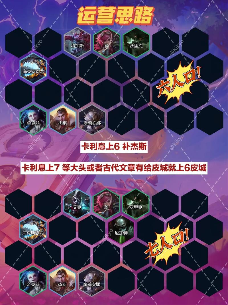 〖Two〗、核心英雄:凯尔、伊泽瑞尔、琴女、塞纳、蔚、猪妹、莎弥拉、劫。羁绊组成:主要羁绊:5地下魔盗团、3源计划、2斗士、2决斗大师、2枪手、1精英战士。装备分配:主C莎弥拉:必备饮血剑,其余输出装备根据敌人阵容选取。前排扛伤:猪妹和蔚带肉装。多余装备:可以给劫。