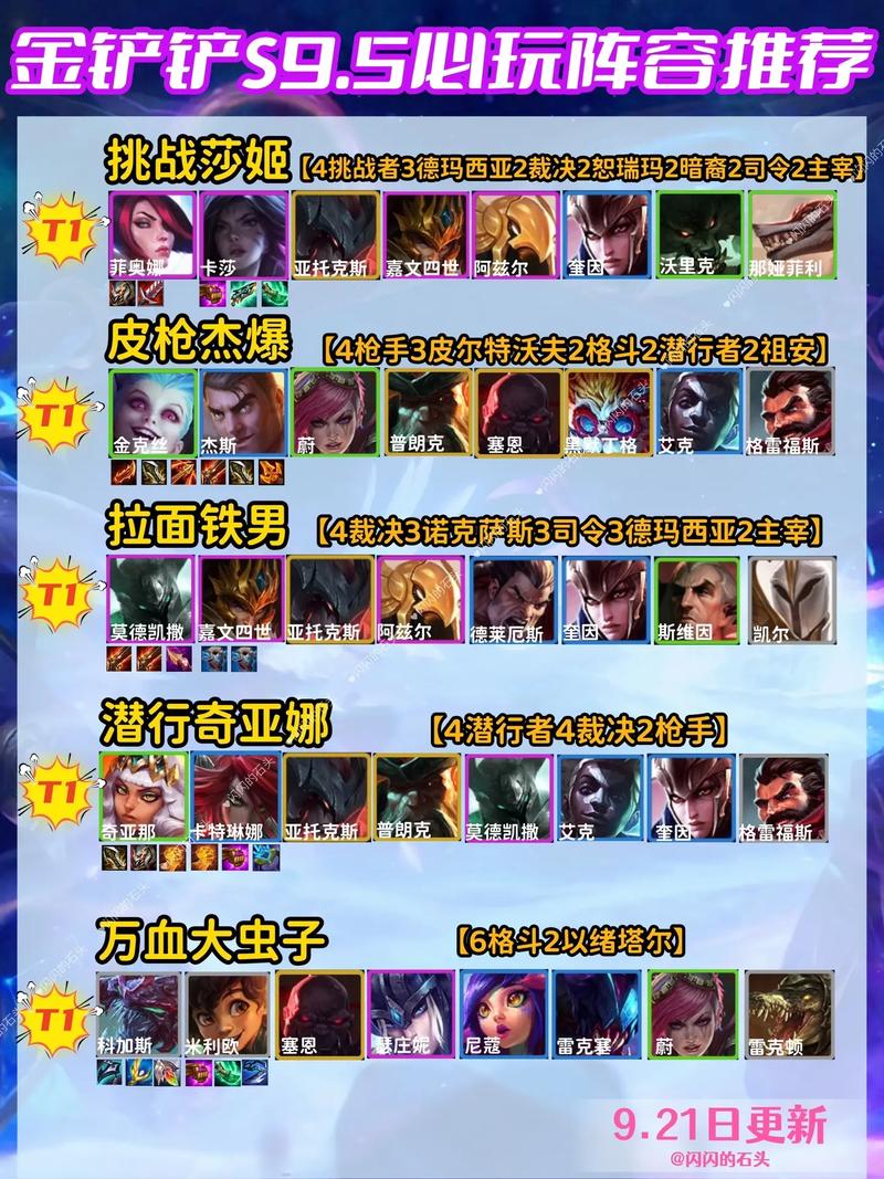 〖Six〗、阵容配置 墨菲特、莫甘娜、拉莫斯、薇古丝、阿利斯塔、烬、派克和努努。 棋子装备 这套阵容对装备没有固定的需求,肉装和输出装都能很好地适应。除了坚如磐石石亮陵亏头人强化需要先拿反甲提升输出外,其他的强化都是先做前排1-2件肉装,再做薇古丝1-2件输出装。