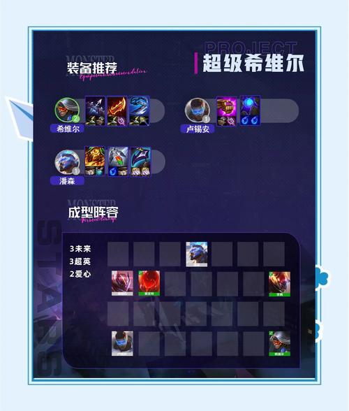 〖One〗、极客九五阵容 核心思路:利用极客羁绊快速获取装备和金币,通过经济优势快速升级人口,最终组成九五至尊的豪华阵容。关键英雄:维克托、金克丝、杰斯等五费卡,以及前期过渡用的极客英雄如艾克、吉格斯等。装备推荐:优先合成无尽之刃、巨人捕手之矛等攻击装,以及蓝霸符等回蓝装。