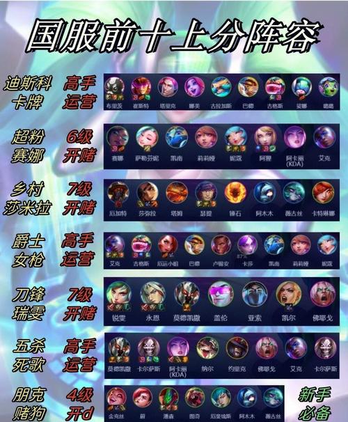 核心英雄:崔斯特和德莱厄斯。玩法特点:二费赌狗阵容,六人口追三星,前中期强度高,崔斯特技能机制越打越痛。阵容定位:混分阵容,成型几乎必吃分,虽然上限不高但吃分稳定,适合新赛季初上分。以上五套阵容各有特色,玩家可根据自身喜好和实际情况选取任意一套进行游戏,都能在新赛季中轻松上大分。