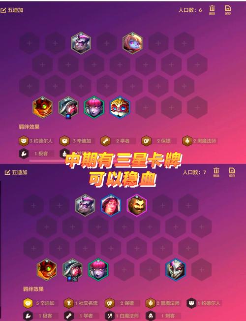 〖Six〗、人口时,补入2保镖,若获得迪迦转职,最优组合为5辛迪加;若转狙神,则组合为4狙神。在5人口时,优先收集所需卡牌,待三星寒冰与三星婕拉出现后,继续提升人口至高羁绊,以追求更高的战斗力与胜率。