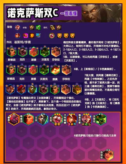 金铲铲之战德莱厄斯与卡特琳娜组成的诺克萨斯双C冷门上分策略如下:阵容组成 核心英雄:德莱厄斯、卡特琳娜其他英雄:厄斐琉斯、艾克、克列、卡西奥佩亚、卡拉拉,共6个诺克萨斯英雄,包括暗裔、潜行者、主宰、裁决战士各一个。英雄之力与强化符文 英雄之力推荐带崔斯特,强化服二杠一必拿卡牌专属技能。