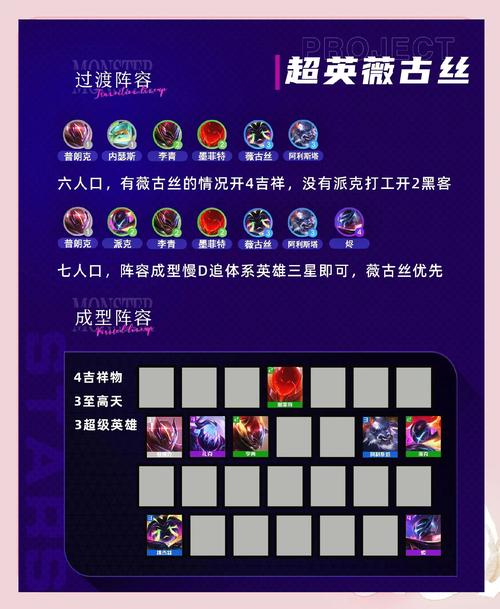 阵容介绍 阵容构成:该阵容以EMO羁绊为核心,搭配护卫、超级粉丝等羁绊,主要依赖三星薇古丝作为主C。阵容在8级成型,基础与Punk Mouse/Judgment Samira相似,后续需要追三费卡三星,并加入4费卡提升上限。装备推荐 主C薇古丝: 必备装备:魔法爆炸、蓝霸符。 可选装备:帽子或防御破坏者。