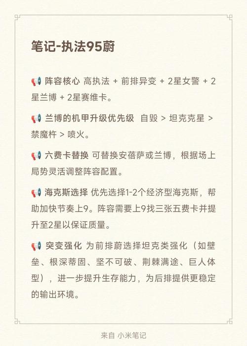〖Three〗、阵容组成 核心成员:崔斯特(卡牌大师)、洛里斯(洛)、麦迪、斯特卜、卡密尔、安蓓萨、蔚、凯特琳(女警)羁绊组合 主要羁绊:8执法官,提供强大的控制与输出能力。次要羁绊:2狙神(凯特琳),增强远程输出;2讯击战士,提供额外的攻击速度与移动速度;1外交官,增加阵容的灵活性。