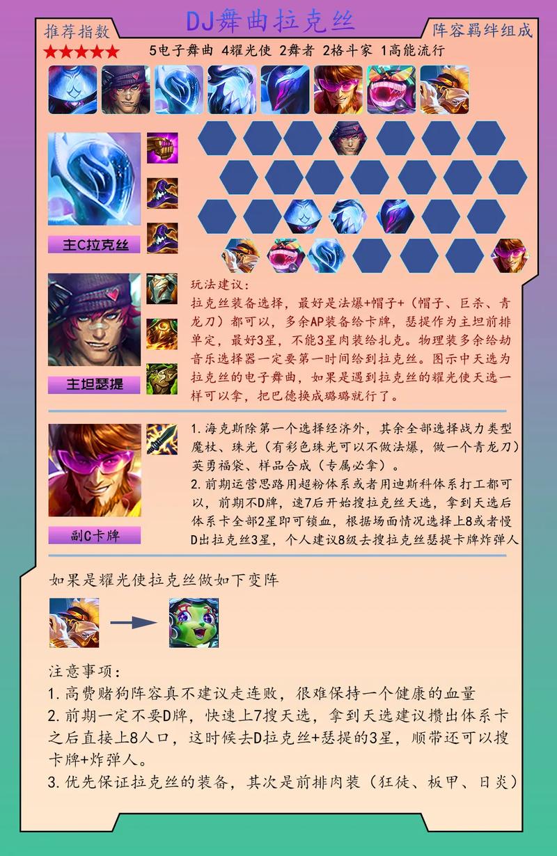 金铲铲之战S10电舞拉克丝玩法解析:阵容组成 核心阵容:拉克丝、扎克、贾克斯、劫、酒桶、卡牌、娜美、炸弹人。羁绊搭配:4电子舞曲、4耀光使、3迪斯科、2格斗。核心英雄装备 拉克丝(主C):青龙刀增加回蓝效率,法爆帽提升技能爆发伤害,确保一个技能瞬间清屏。