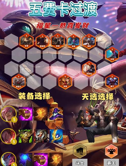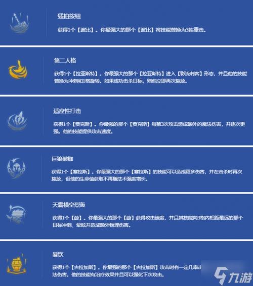 羽量级选手:增强低费卡输出能力,加快启动速度。并肩作战:增加额外属性加成,适合多低费卡阵容。便携锻炉:提供额外装备和装备升级机会。狩猎律动:提供额外治疗效果和击杀奖励,增强续航能力。意外之财:提供额外金币收益,加速经济发育。