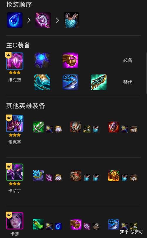 〖Three〗、首先获取纹章之书和虚空之心或虚空之冕,若没有虚空之心或虚空之冕,无法组成8虚空羁绊,可考虑其他符文如珠光莲花、经济强化符文等。装备分析 卡莎的装备必须包括鬼索的狂暴之刃,其余装备可根据之前版本的装备选取,电刀、珠光护手、巨人捕手、海克斯科技枪刃、大天使之杖等,根据实际情况选取。