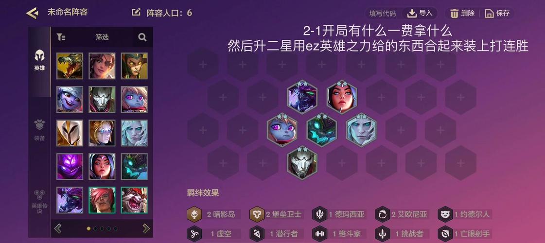 金铲铲之战s5赛季迅捷EZ阵容的运营思路如下:开局与过渡:开局:优先拿取【大棒】,这是为了尽早合成伊泽瑞尔的关键法术装备。过渡:使用3星界进行过渡,21阶段不拉升人口。如果能在早期获得三星伊泽瑞尔,可以在面对石头人时梭哈金币进行搜卡;如果没有三星伊泽瑞尔,则节省金币,按照正常节奏上人口。
