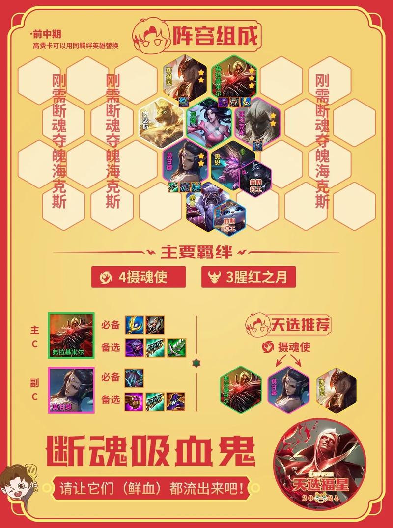 金铲铲之战清仓大甩卖阵容装备搭配攻略阵容介绍标准阵容:3山海绘卷2幽魂2神谕者1画圣这套阵容,彗十分关键,8级只要有1张彗,这把基本上保底出2个三星四费,如果没有彗的话,可以上2个泰坦/奥恩/安妮,艾希如果没装备,可以换成辛德拉,没装备的寒冰就是个挂件。