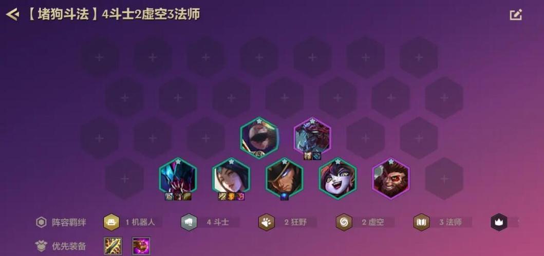 副核心搭配 副核心英雄应与核心英雄相辅相成,提高整体阵容的输出和生存能力。剑魔、剑圣、剑姬等英雄是不错的选取。前排坦克搭配 前排坦克英雄应具备较高的生存能力,为后排输出英雄提供保护。石头人、猪妹等英雄能够很好地胜任这一角色。