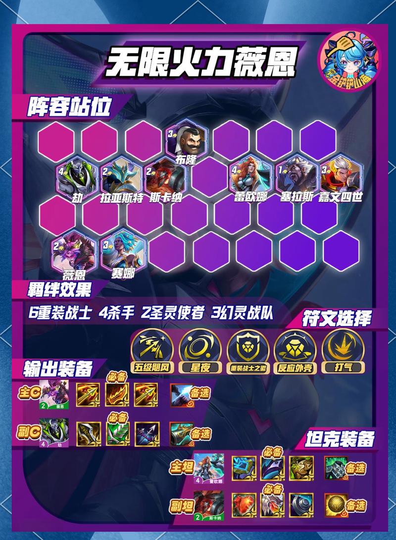 〖One〗、副核心英雄应与核心英雄相辅相成,提高整体阵容的输出和生存能力。剑魔、剑圣、剑姬等英雄是不错的选取。前排坦克搭配 前排坦克英雄应具备较高的生存能力,为后排输出英雄提供保护。石头人、猪妹等英雄能够很好地胜任这一角色。输出辅助搭配 输出辅助英雄应具备较高的输出能力,为后排输出英雄提供火力支援。