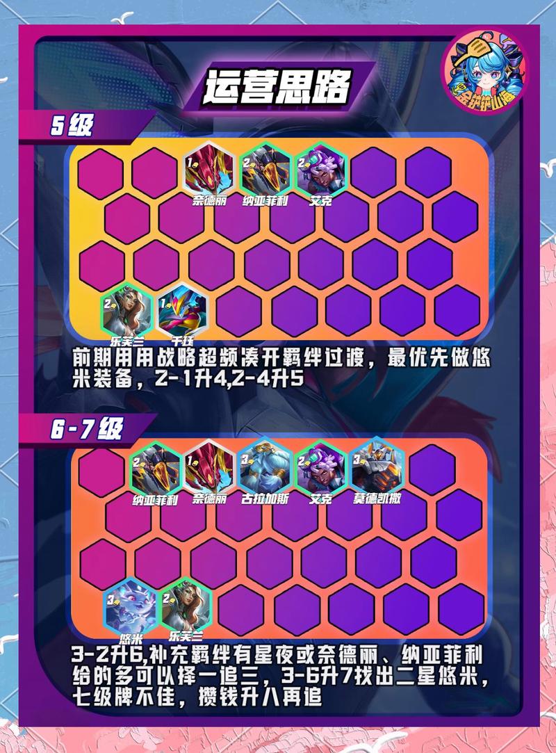 〖Three〗、第一套阵容:4赛博老大/3战略/3恶魔 核心思路:以吉格斯为主C,通过4赛博老大的羁绊提升坦度和伤害。后期强化:可以寻找佛耶戈作为副C,进一步提升阵容上限。盖伦和佛耶戈的装备选取能极大增强阵容的整体实力。优势:高伤害和坦度并存,佛耶戈的加入增加了阵容的灵活性和输出能力。