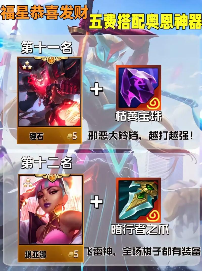 〖Four〗、金铲铲之战恭喜发财奥恩阵容搭配推荐如下:开局策略:连败策略:若开局装备较差,建议选取奥恩进行连败,确保经济增长,为后期做铺垫。天选福星搭配:若抽到天选福星,建议尽快选取并搭配上6福星阵容,如奥拉夫和锐雯,他们需要神器支持,以形成强势阵容。前期过渡:继续执行连败策略,以降低战斗损失并积累金币。