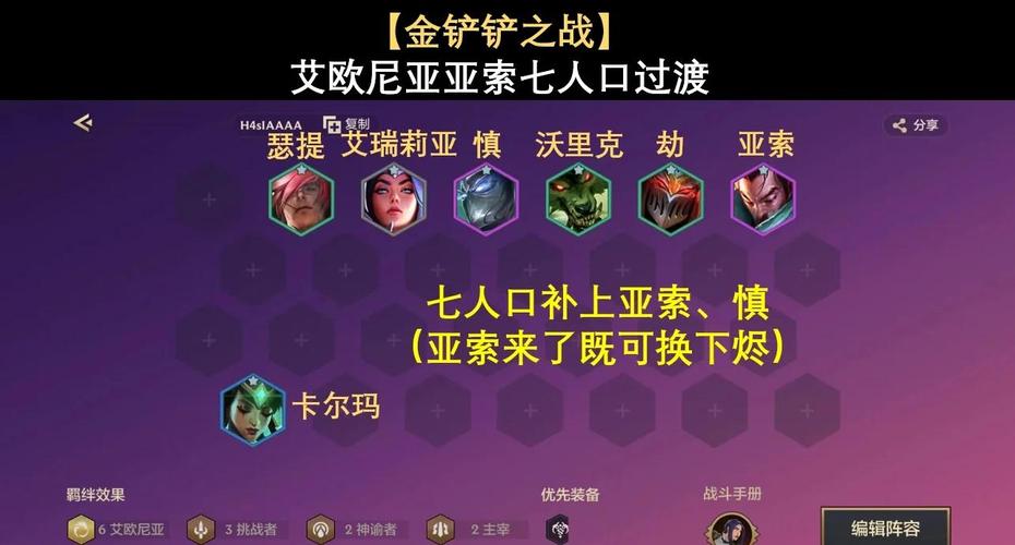 阶段:根据装备情况决定是否玩此阵容,反曲弓多可考虑。打工阵容:根据来牌选取,如神盾哨兵、4黎明等,亚索装备可给予豹女、奥拉夫或锐雯过渡。3阶段:32升级6人口,稳定血量,考虑小D提升质量,向黑夜铁盾亚索转型。此阵容依赖亚索的三星及装备成型,因此前期需稳定运营,确保中期有足够的经济去D牌。