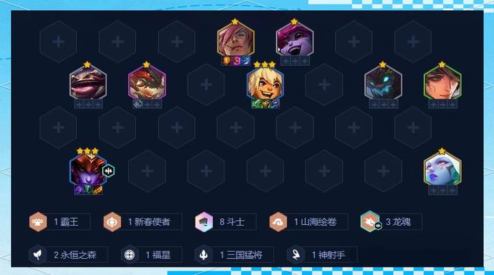 〖Two〗、金铲铲之战S10天选福星八斗龙女阵容搭配方法如下: 阵容介绍- 羁绊组成:龙女龙魂天选,8斗士,3龙魂。- 阵容特点:龙女天选效果是直接变身,搭配高斗士超肉的前排,后期还有腕豪这个斗士大杀器。此外,这套阵容和轮子妈阵容装备通用,互通能用的卡也比较多,可以灵活转换。