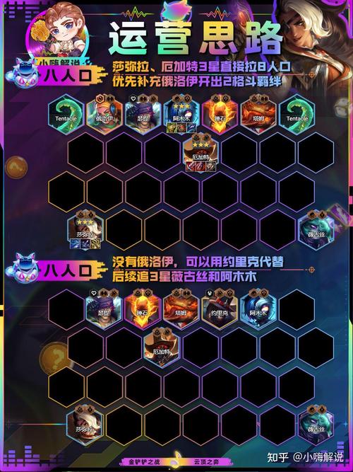 金铲铲之战S10强力阵容——高法萨勒芬妮阵容:阵容组成:核心英雄:萨勒芬妮、妮蔻、酒桶、艾克、琴女(娑娜)、露露、俄洛伊、狐狸羁绊组合:7法师、3刺客、2格斗家、1高能英雄,8人口即可阵容大成阵容特点:高爆发输出:萨勒芬妮作为主C,配合其法师天选的专属效果和法师羁绊的击败效果,能够造成爆炸性的多重打击。