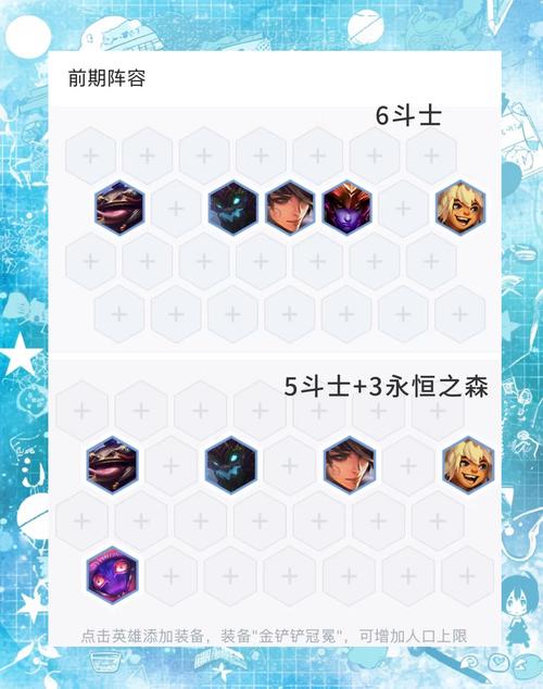 阵容构成:6斗士+3永恒之森。包括大树(斗士天选)、塔姆、蔚、璐璐、努努和腕豪。推荐装备:为腕豪准备法爆、正义和破防等装备,以提高其技能伤害和生存能力。后期转型阵容 阵容构成:6福星+4战神+2斗士+2重装+2刺客。