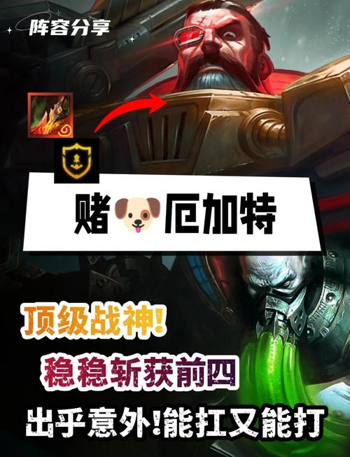 核心羁绊:4亡眼射手、3巨神峰、2弗雷尔卓德、2祖安、2堡垒卫士、2神谕者。阵容码:使用特定阵容码可快速构建阵容(具体阵容码已省略,但可通过游戏内或相关论坛获取)。装备搭配 主C厄加特:必备神器:火炮(增加攻击距离,扩大锥形AOE伤害范围)。