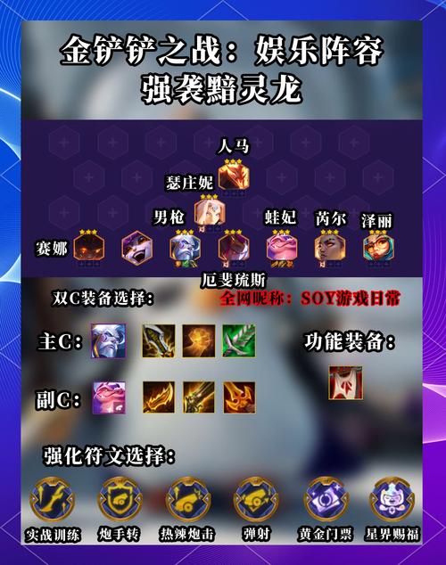 金铲铲之战:龙魂阵容搭配指南与推荐策略 英雄选取 前期过渡:选取龙魂刺客或射手,如卡莎、伊芙琳,这些英雄能迅速清理小兵,积累经济优势。中期加强:引入高费卡牌,如阿木木、艾希(控制型英雄)以及维克兹(高爆发法师),增强阵容控制力和爆发力。