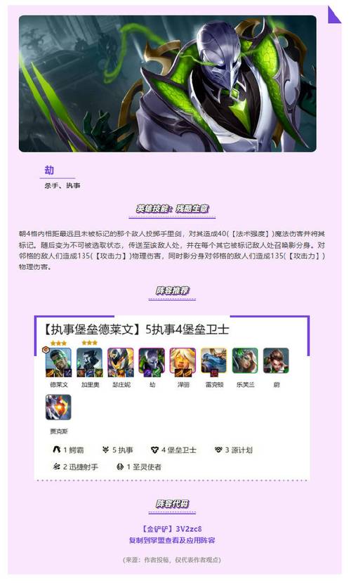 阵容搭配:厄运小姐适合与辛迪加和活力小子羁绊的英雄搭配使用,以获得额外的生命值、法术强度加成以及法力值回复和治疗效果。同时,搭配前排坦克和控制英雄也能为厄运小姐创造更好的输出环境。综上所述,厄运小姐是金铲铲之战s14赛季中一位非常强大的英雄,她的技能具有高额的物理伤害和独特的范围攻击机制。